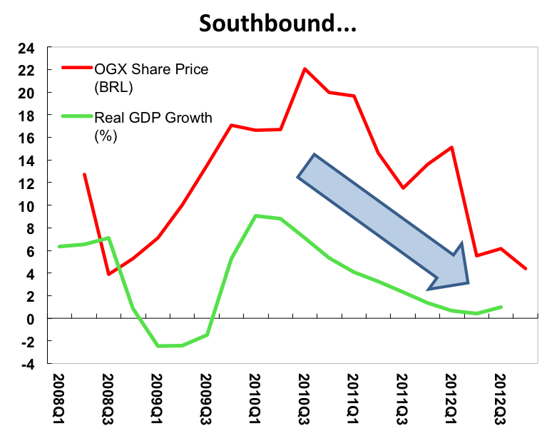 The good news for Brazil is that, while we might not be able to help Mr. Batista’s business fortunes, we probably know how to tackle the bottlenecks that are constraining the country’s potential growth. Structural reforms, in particular tax reform (simplifying the tax code, broadening the base, lowering some rates) and labor market reform as well as crucial infrastructure upgrades have been on the agenda for many years. However, the only area the government is addressing so far is infrastructure, which is being ramped up in preparation for the 2014 World Cup. While to government is clearly making an effort here, even breaking leftist taboos by privatizing some airports, things are progressing at a painfully slow pace.