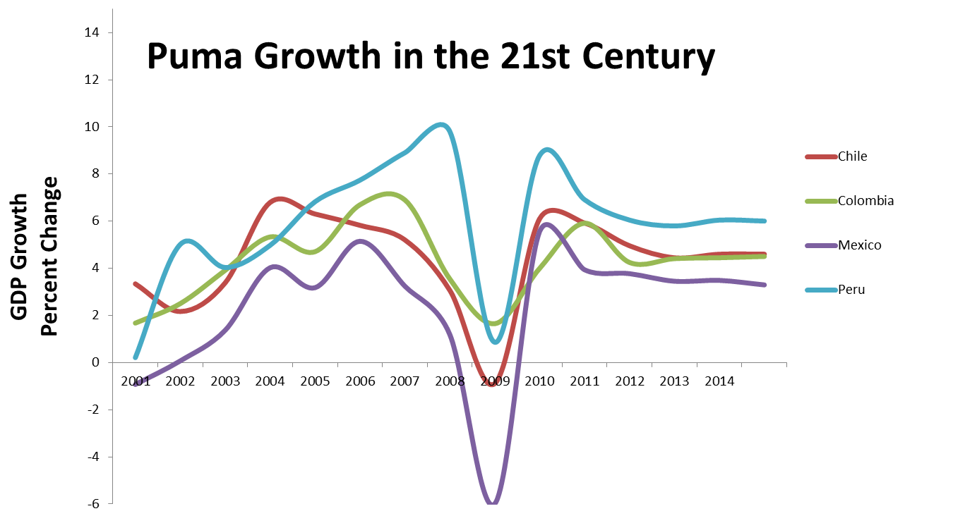 In contrast to the increasingly protectionist Mercosur, Puma countries have aggressively pursued liberalized trade, surely cognizant of East Asia’s success. While the US has concluded free trade agreements (FTAs) with Mexico (1994), Chile (2004), Peru (2009) and Colombia (2012), Puma countries have expanded well beyond the western hemisphere, participating in numerous Pacific trade pacts. All four Puma countries have successfully negotiated FTAs with the European Union. Mercosur has not.