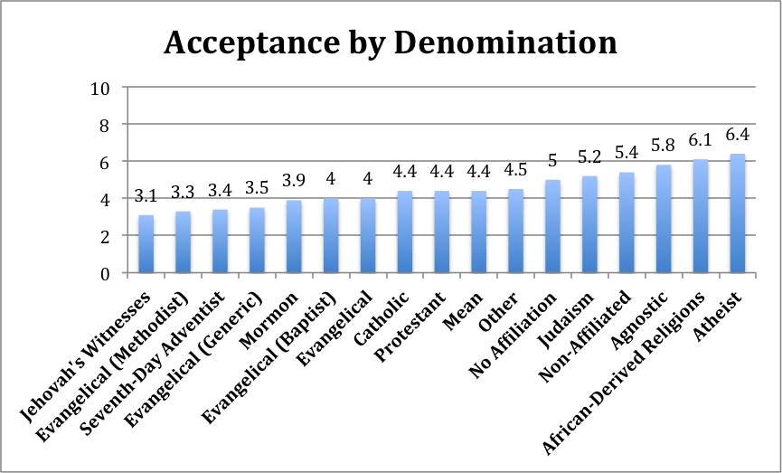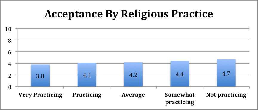 The influence of religious affiliation is debatable, though clear trends show that protestant evangelical Latin Americans hold more hostile views than their Catholic, Jewish or non-religious countrymen. Most interestingly, those practicing African-derived religions register acceptance levels near those of atheists and agnostics—perhaps a nod to anecdotal evidence that attitudes towards homosexuality were mainly the product of European legal and religious structures.
