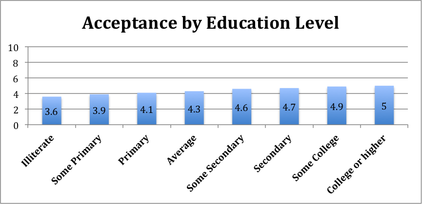 As many global observers of LGBT rights may expect, acceptance in Latin America directly correlates with education levels, and the degree of religious dedication. Broadly speaking, those with less of the former and more of the latter hold less tolerant views, while those with more education and less frequent religious attendance hold more tolerant views.
