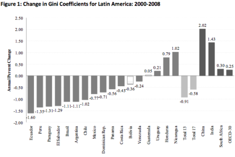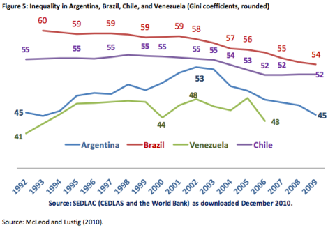 A fabulous study from academic standard bearers Nancy Birdsall, Nora Lustig and Darrell McLeod supports this view, and I’ve pulled a few of the charts below to illustrate the Gini comparisons between our two groups of Latin American countries. The GINI coefficient isn’t perfect, but it’s indicative.