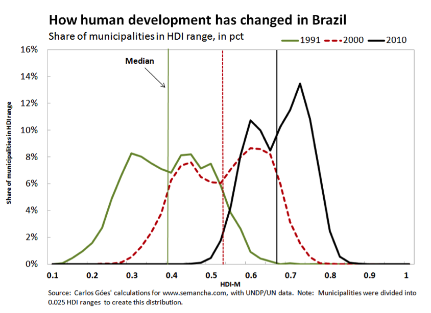 The numbers are encouraging and, as they use census data, there is a high degree of granularity in the analysis. The Atlas measures the HDI for each of Brazil’s 5,570 municipalities (the equivalent to “counties” in the US). The graph below illustrates the changes. As the curves slid to the right over time, municipalities became more developed. In a similar fashion, as they grew taller, with narrower tails, municipalities became less unequal.