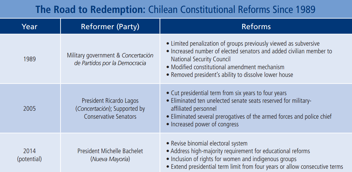 Chilean President Michelle Bachelet’s latest initiatives to reform her country’s constitution are indicative of Chile’s 25-year effort to responsibly reform the severely flawed document installed by the Pinochet dictatorship.