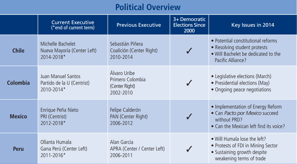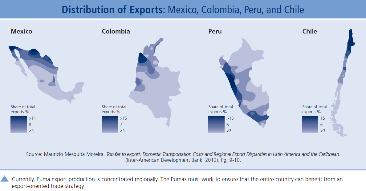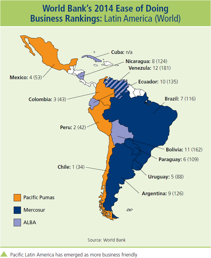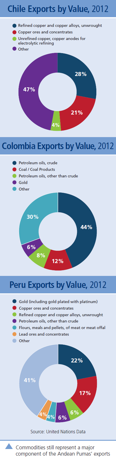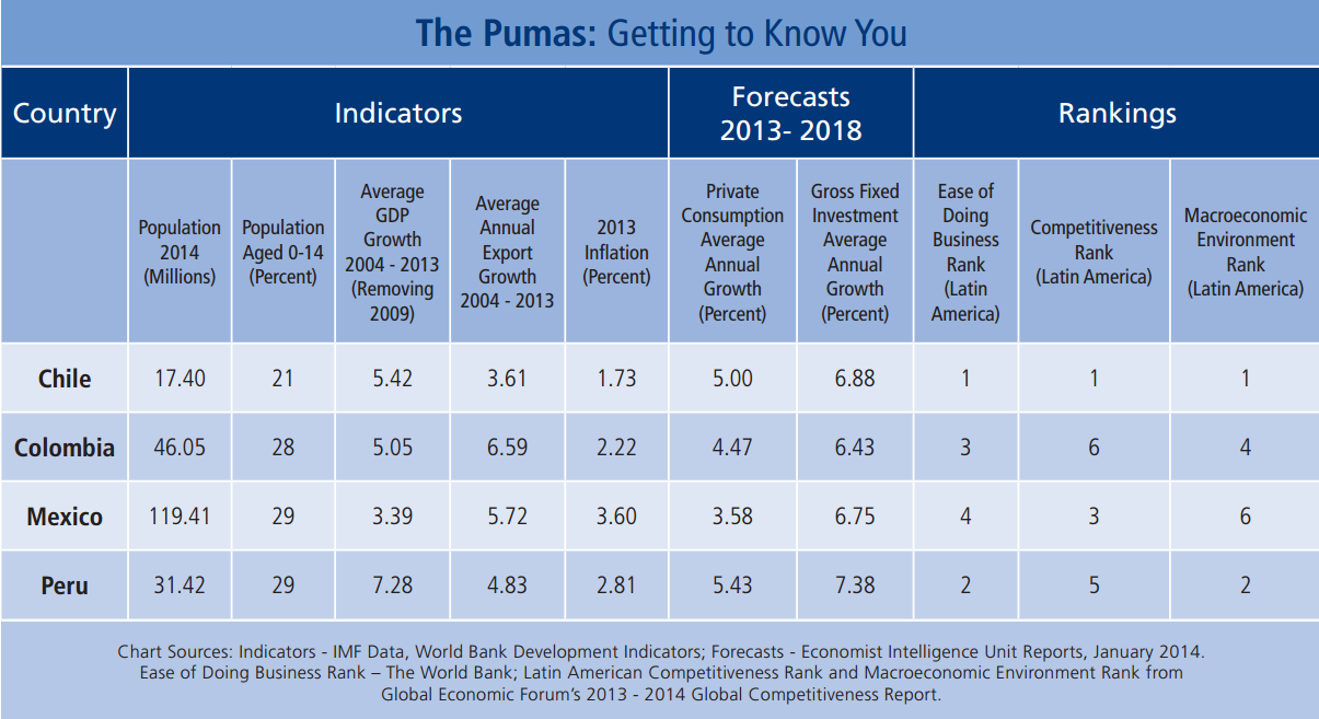 The Pacific Pumas’ economic indicators and forecasts suggest growth in population, gross domestic production, consumption and gross fixed investment. The younger population signals that the four countries will enjoy favorable demographic conditions in the coming years. The rankings are subjective, but they are indicative of the business community’s current affinity for the four countries.