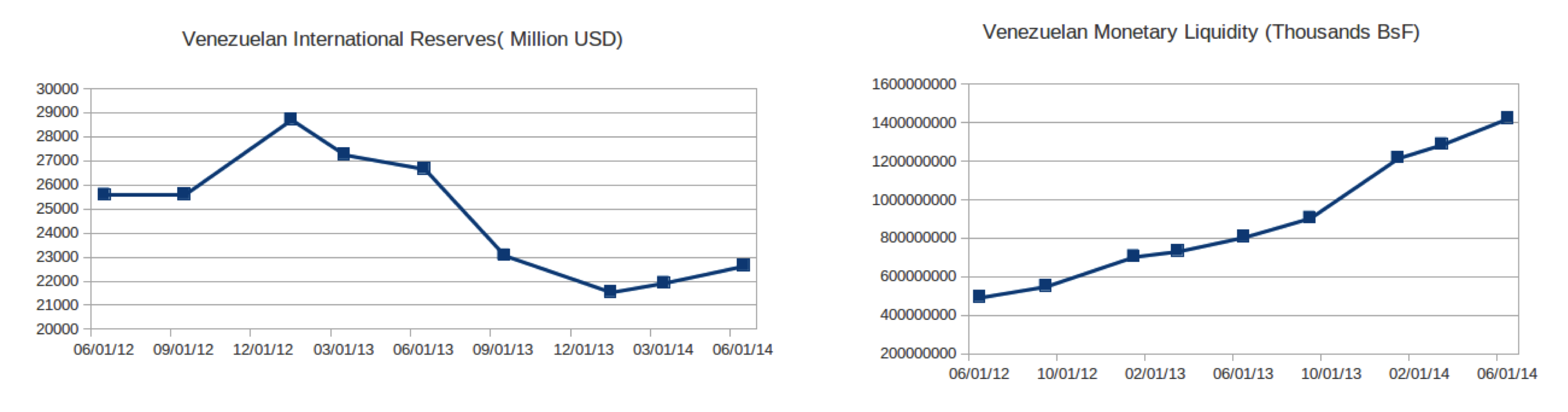 The country’s continued reliance on oil exports and import of basic goods is exerting a great toll on it’s economy. While government officials insist that there is no foreign currency crisis, there has been a continuous fall in Venezuela’s international reserves. The nation’s liquid reserves hit a historical minimum in September 2013 and has barely recovered since, while the amount money in circulation continues to rise. The result? An inflation rate of over 60 percent and a great shortage of many goods.