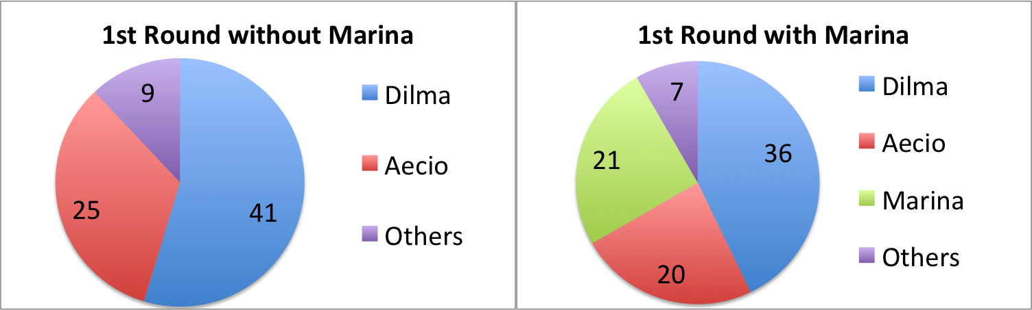 In a first round without Campos or Marina, incumbent Dilma Rousseff (PT) and her remaining rival Aécio Neves (PSDB) were both up 5 percentage points relative to their July poll (36 to 41 and 20 to 25 percent respectively). However, given the still large number of blank, invalid and undecided voters in this scenario (25 percent), Dilma would win in the first round with an absolute majority of the valid vote (55 percent).