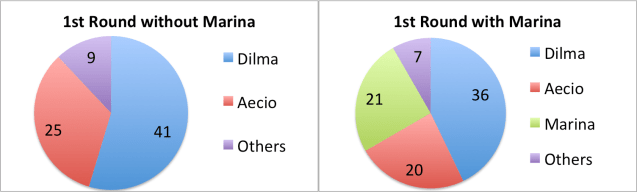The real surprise is that according to this result, Marina would be ahead of Aécio who would hence miss the runoff! Now, the 1 point difference between the two opposition candidates is very small and well within the margin of error (2 percentage points either way). But it means that if Marina runs, Aécio, will have to fight to secure second place.