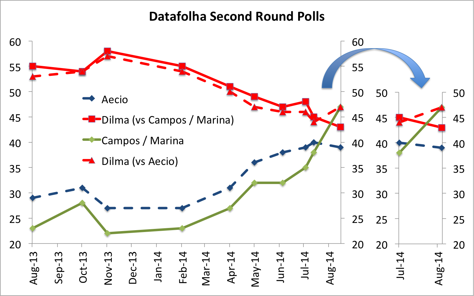Only a day after the remains of Eduardo Campos were laid to rest in a giant funeral in Recife on Sunday, August 17th, Datafoha came out with a new poll including the likely new candidate Marina Silva.