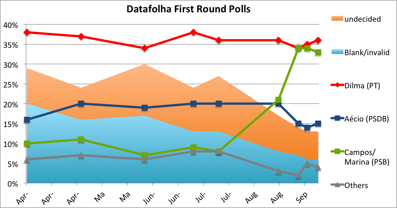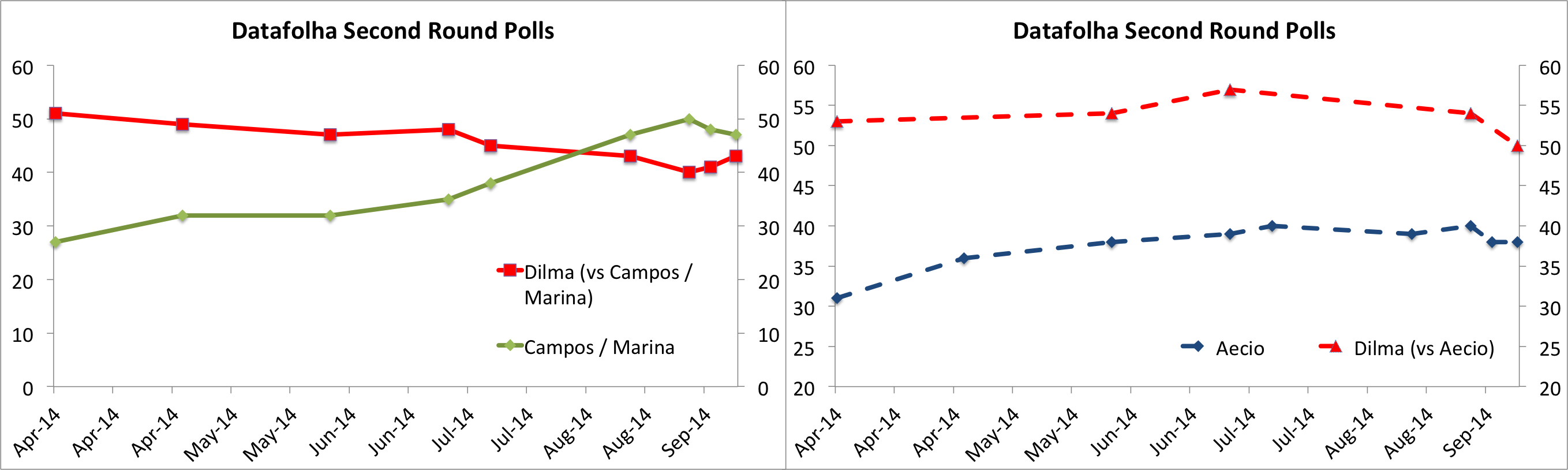 Since then, two more Datafolha polls were taken, showing the race stabilizing, with a slight advantage opening up for Dilma, the incumbent.