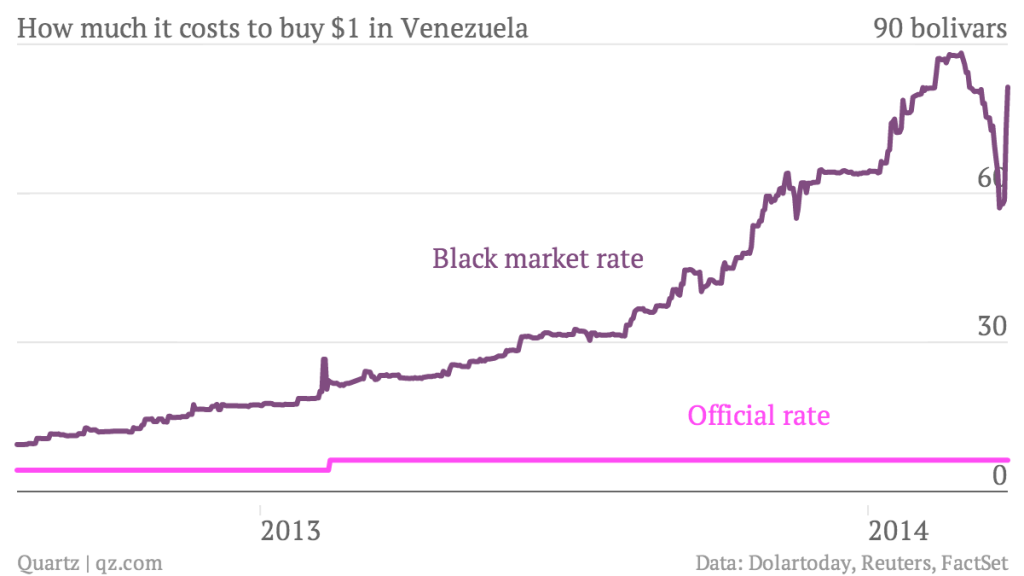 This graph from March 2014 shows the trajectory of the US dollar on the black market. In recent months it has continued to deteriorate. Source: Quartz