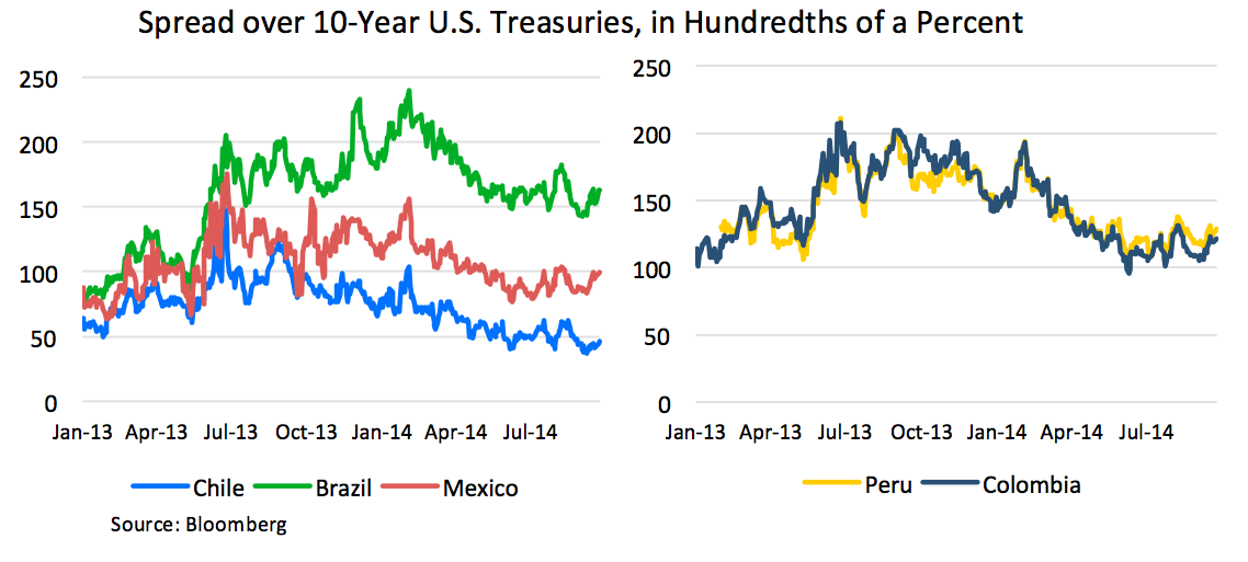 Though borrowing costs (as measured by the spread in basis points, or hundredths of a percent, over US Ten-year Treasury yields) are now back to pre-May 2013 lows, Colombia, for one, is not taking any chances.