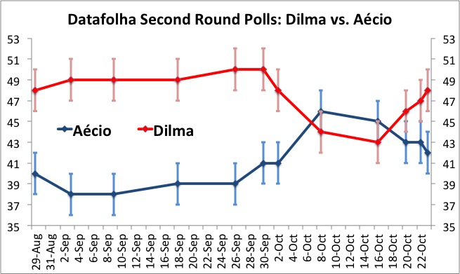 Now what does this mean? Not much, says the Aécio camp, after all the polls were pretty far off in the first round. However, they generally were right about the momentum. They did see Aécio rising as the vote approached, they just didn’t see him as clearly ahead of Marina Silva as he ended up on election night. Extrapolation of the trend over the last view polls could have given you a good approximation of the first round result. Right now, such an extrapolation (which I don’t endorse) would show a clear Dilma win.