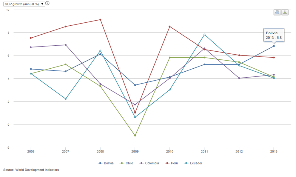 Bolivia’s economic ascent and stabilization during the Morales administration is difficult to ignore. The economy has expanded threefold—from US$10 billion to US$30 billion dollars—since 2006. From 2006 to 2013, Bolivia posted annual growth rates of 5.6 percent, one of the highest in the region.