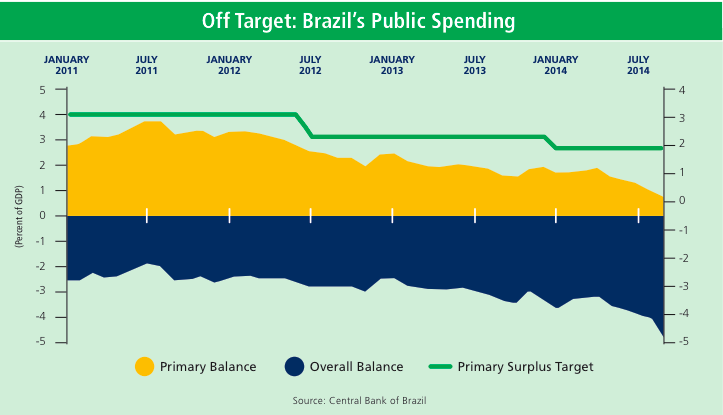 Yet while revenues have recently tapered, spending has not. The primary (pre-interest) surplus target, a crucial pillar of Brazil’s tripod of macroeconomic stability (the other two are inflation targeting and a flexible exchange rate ), has been continuously lowered and missed since 2011. Fiscal results for 2014 point to an all-but-complete erosion of the primary surplus.