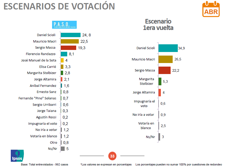 So let’s start from the top. For one, the poll does show PJ candidate Daniel Scioli in the lead over Mauricio Macri: