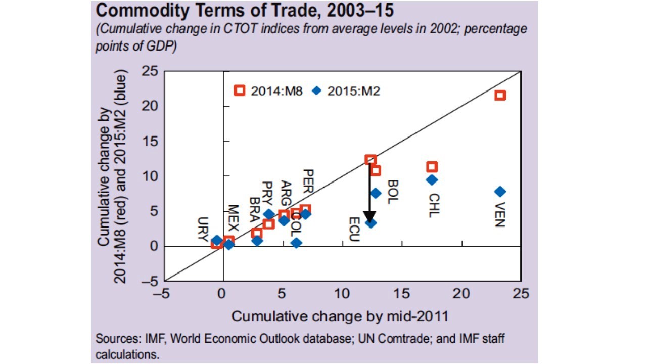 IMF (2015, ch. 3) brings estimates of country-specific “commodity terms of trade” (CTOT) indices across the region. Those are indices in which price changes of individual commodities are weighted according to their (net) export value, and are normalized by GDP. A certain increase (decrease) in CTOT is thus a way to gauge the net gain (loss) of commodity price movements in GDP terms.